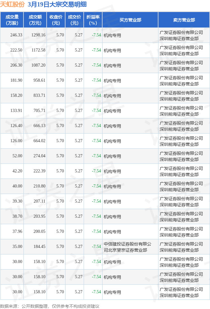 证券之星消息,3月19日天虹股份发生大宗交易,交易数据如下: