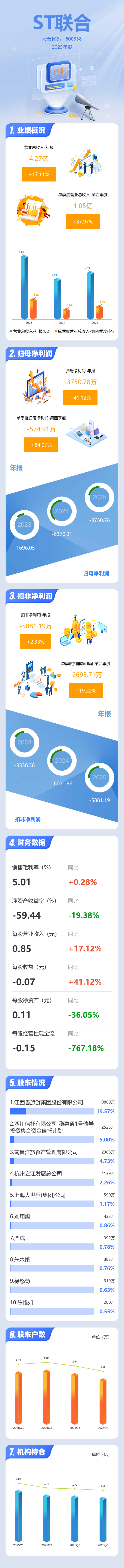 证券之星消息,ST联合2025年年报显示,当年度公司主营收入4.27亿元,同比上升17.12%;归母净利润-3750.78万元,同比上升41.12%;扣非净利润-5881.19万元,同比上升2.34%;其中2025年第四季度,公司单季度主营收入1.05亿元,同比上升37.97%;单季度归母净利润-574.91万元,同比上升84.08%;单季度扣非净利润-2693.71万元,同比上升19.23%;负债率86.47%,投资收益9.07万元,财务费用1474.93万元,毛利率5.01%。