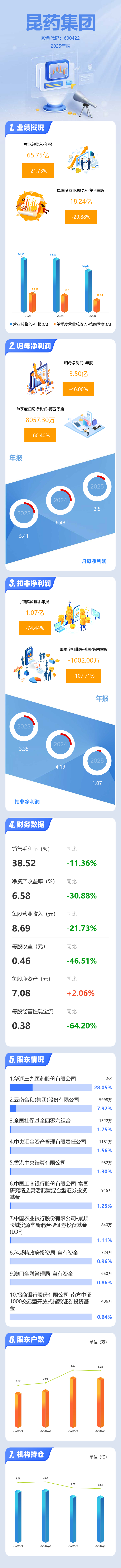 证券之星消息,昆药集团2025年年报显示,当年度公司主营收入65.75亿元,同比下降21.74%;归母净利润3.5亿元,同比下降46.0%;扣非净利润1.07亿元,同比下降74.45%;其中2025年第四季度,公司单季度主营收入18.24亿元,同比下降29.88%;单季度归母净利润8057.3万元,同比下降60.4%;单季度扣非净利润-1002.0万元,同比下降107.72%;负债率41.04%,投资收益6201.12万元,财务费用4325.21万元,毛利率38.52%。