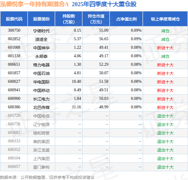 泓德悦享一年持有期混合A的前十大重仓股如下: