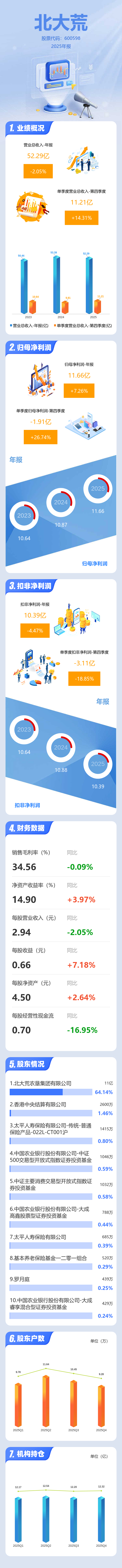 证券之星消息,北大荒2025年年报显示,当年度公司主营收入52.29亿元,同比下降2.05%;归母净利润11.66亿元,同比上升7.26%;扣非净利润10.39亿元,同比下降4.48%;其中2025年第四季度,公司单季度主营收入11.21亿元,同比上升14.31%;单季度归母净利润-1.91亿元,同比上升26.75%;单季度扣非净利润-3.11亿元,同比下降18.85%;负债率12.93%,投资收益-3101.86万元,财务费用-1280.65万元,毛利率34.56%。