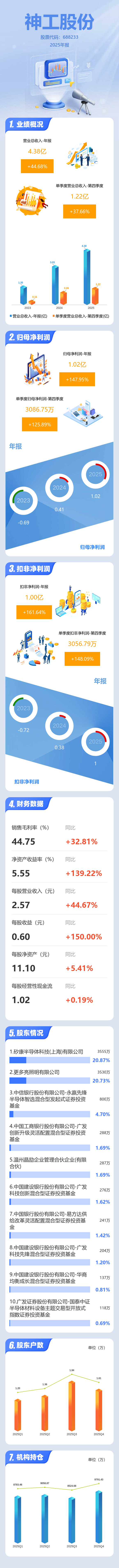 证券之星消息,神工股份2025年年报显示,当年度公司主营收入4.38亿元,同比上升44.68%;归母净利润1.02亿元,同比上升147.96%;扣非净利润1.0亿元,同比上升161.64%;其中2025年第四季度,公司单季度主营收入1.22亿元,同比上升37.67%;单季度归母净利润3086.75万元,同比上升125.89%;单季度扣非净利润3056.79万元,同比上升148.09%;负债率5.71%,投资收益150.13万元,财务费用-1083.48万元,毛利率44.75%。