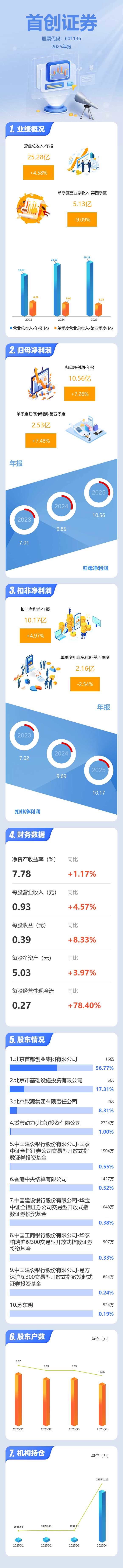 证券之星消息,首创证券2025年年报显示,当年度公司主营收入25.28亿元,同比上升4.58%;归母净利润10.56亿元,同比上升7.26%;扣非净利润10.17亿元,同比上升4.97%;其中2025年第四季度,公司单季度主营收入5.13亿元,同比下降9.1%;单季度归母净利润2.53亿元,同比上升7.49%;单季度扣非净利润2.16亿元,同比下降2.54%;负债率73.71%,投资收益18.73亿元。