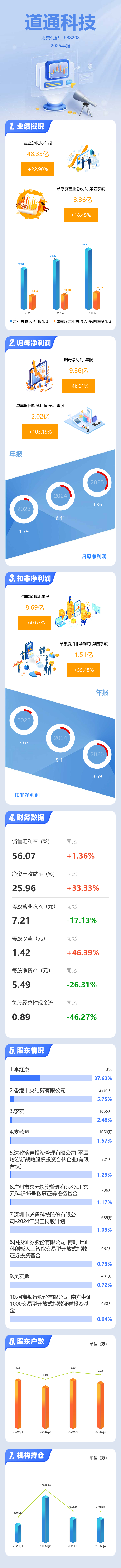 证券之星消息,道通科技2025年年报显示,当年度公司主营收入48.33亿元,同比上升22.9%;归母净利润9.36亿元,同比上升46.02%;扣非净利润8.69亿元,同比上升60.67%;其中2025年第四季度,公司单季度主营收入13.36亿元,同比上升18.46%;单季度归母净利润2.02亿元,同比上升103.19%;单季度扣非净利润1.51亿元,同比上升55.49%;负债率49.17%,投资收益7358.64万元,财务费用-1645.24万元,毛利率56.07%。