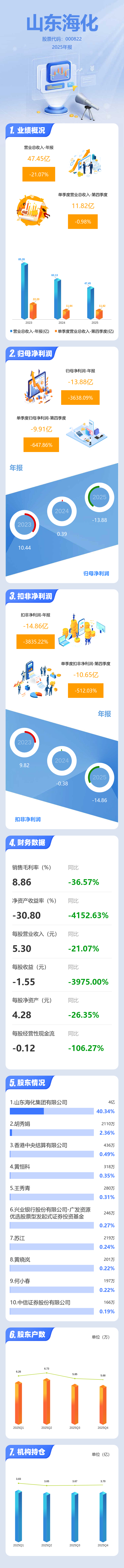 证券之星消息,山东海化2025年年报显示,当年度公司主营收入47.45亿元,同比下降21.07%;归母净利润-13.88亿元,同比下降3638.09%;扣非净利润-14.86亿元,同比下降3835.22%;其中2025年第四季度,公司单季度主营收入11.82亿元,同比下降0.98%;单季度归母净利润-9.91亿元,同比下降647.87%;单季度扣非净利润-10.65亿元,同比下降512.04%;负债率56.92%,投资收益-1265.69万元,财务费用520.24万元,毛利率8.86%。