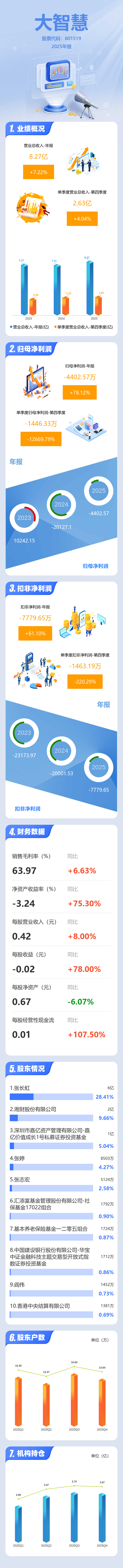 证券之星消息,大智慧2025年年报显示,当年度公司主营收入8.27亿元,同比上升7.23%;归母净利润-4402.57万元,同比上升78.13%;扣非净利润-7779.65万元,同比上升61.1%;其中2025年第四季度,公司单季度主营收入2.63亿元,同比上升4.04%;单季度归母净利润-1446.33万元,同比下降12669.79%;单季度扣非净利润-1463.19万元,同比下降220.29%;负债率29.32%,投资收益3266.65万元,财务费用-1822.21万元,毛利率63.97%。
