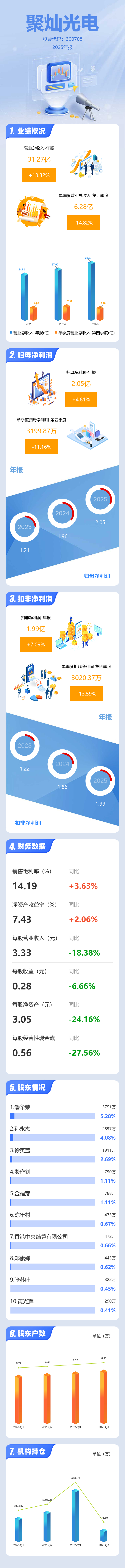 证券之星消息,聚灿光电2025年年报显示,当年度公司主营收入31.27亿元,同比上升13.33%;归母净利润2.05亿元,同比上升4.82%;扣非净利润1.99亿元,同比上升7.1%;其中2025年第四季度,公司单季度主营收入6.28亿元,同比下降14.82%;单季度归母净利润3199.87万元,同比下降11.17%;单季度扣非净利润3020.37万元,同比下降13.59%;负债率43.83%,投资收益-115.13万元,财务费用-3104.86万元,毛利率14.19%。