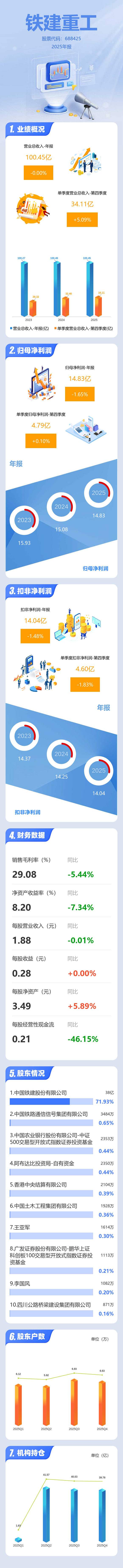 证券之星消息,铁建重工2025年年报显示,当年度公司主营收入100.45亿元,同比下降0.01%;归母净利润14.83亿元,同比下降1.65%;扣非净利润14.04亿元,同比下降1.49%;其中2025年第四季度,公司单季度主营收入34.11亿元,同比上升5.1%;单季度归母净利润4.79亿元,同比上升0.11%;单季度扣非净利润4.6亿元,同比下降1.83%;负债率31.82%,投资收益1.97亿元,财务费用1567.03万元,毛利率29.08%。