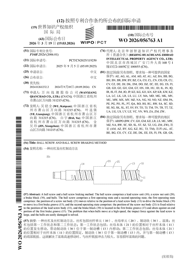 证券之星消息,根据企查查数据显示万向钱潮(000559)公布了一项国际专利申请,专利名为“一种丝杠及丝杠制动方法”,专利申请号为PCT/CN2025/119250,国际公布日为2026年3月19日。