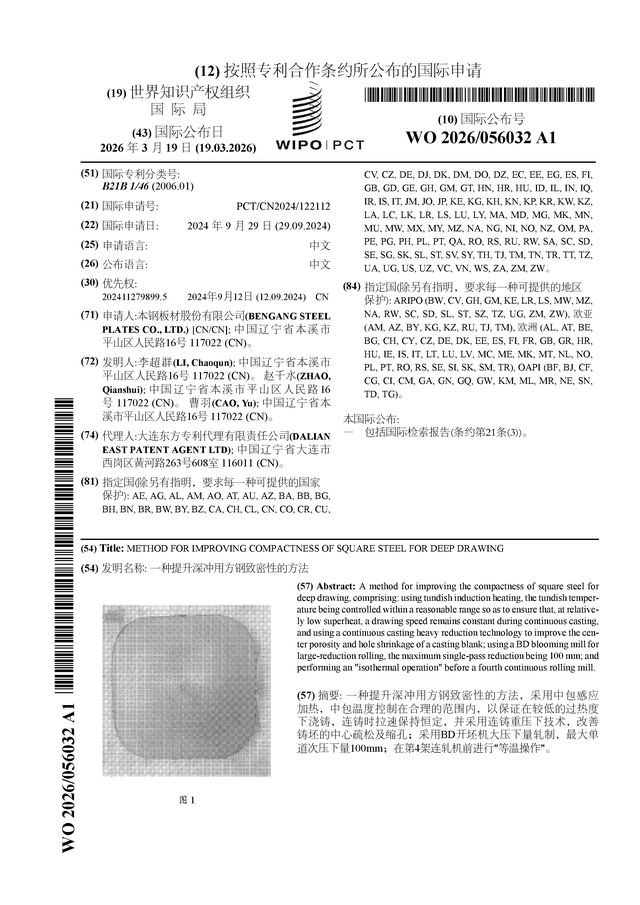 证券之星消息,根据企查查数据显示本钢板材(000761)公布了一项国际专利申请,专利名为“一种提升深冲用方钢致密性的方法”,专利申请号为PCT/CN2024/122112,国际公布日为2026年3月19日。