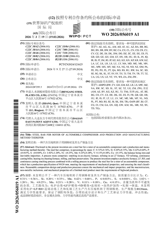 证券之星消息,根据企查查数据显示本钢板材(000761)公布了一项国际专利申请,专利名为“一种汽车压缩机转子用钢棒材及其生产制备方法”,专利申请号为PCT/CN2024/121625,国际公布日为2026年3月19日。