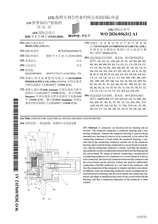 证券之星消息,根据企查查数据显示阳光电源(300274)公布了一项国际专利申请,专利名为“一种连接器、电器件外壳及逆变器”,专利申请号为PCT/CN2025/094172,国际公布日为2026年3月19日。