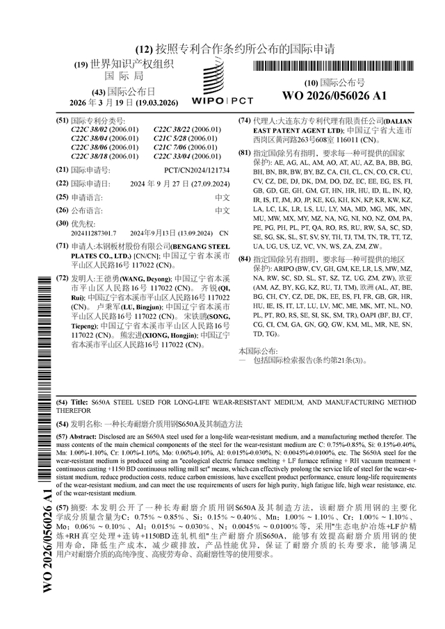 证券之星消息,根据企查查数据显示本钢板材(000761)公布了一项国际专利申请,专利名为“一种长寿耐磨介质用钢S650A及其制造方法”,专利申请号为PCT/CN2024/121734,国际公布日为2026年3月19日。