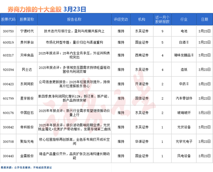 贵州茅台也备受券商关注,近一个月获国信证券、东吴证券、华源证券等5份券商研报关注,位居3月23日券商力推股榜第二。