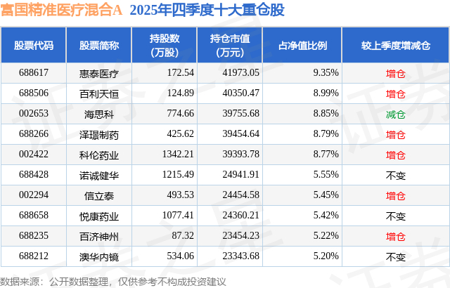 富国精准医疗混合A的前十大重仓股如下: