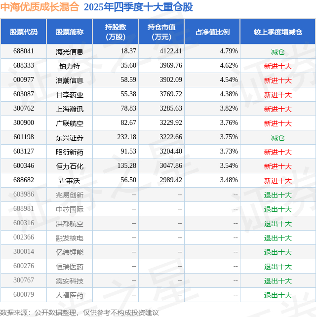 中海优质成长混合的前十大重仓股如下: