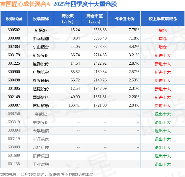 根据2025基金年报公募基金重仓股数据,重仓该股的公募基金共17家,其中持有数量最多的公募基金为富国基金的富国匠心成长混合A。富国匠心成长混合A目前规模为1.36亿元,最新净值2.3023(3月20日),较上一交易日下跌0.65%,近一年上涨48.89%。该公募基金现任基金经理为徐智翔。徐智翔在任的基金产品包括:富国新材料新能源混合A,管理时间为2021年11月4日至今,期间收益率为20.28%;富国天瑞强势混合A,管理时间为2023年7月28日至今,期间收益率为51.09%;