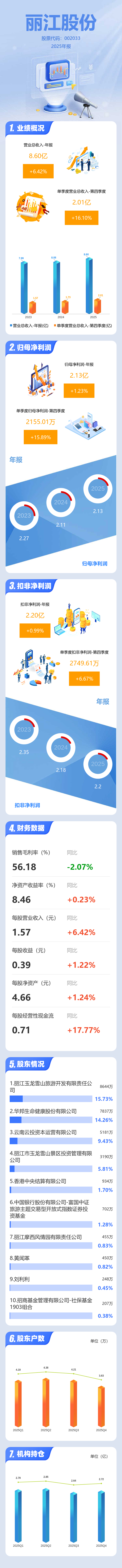证券之星消息,丽江股份2025年年报显示,当年度公司主营收入8.6亿元,同比上升6.42%;归母净利润2.13亿元,同比上升1.24%;扣非净利润2.2亿元,同比上升0.99%;其中2025年第四季度,公司单季度主营收入2.01亿元,同比上升16.11%;单季度归母净利润2155.01万元,同比上升15.9%;单季度扣非净利润2749.61万元,同比上升6.68%;负债率8.62%,投资收益1632.19万元,财务费用122.09万元,毛利率56.18%。