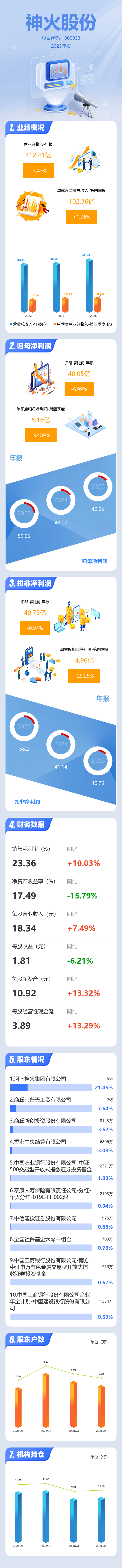 证券之星消息,神火股份2025年年报显示,当年度公司主营收入412.41亿元,同比上升7.47%;归母净利润40.05亿元,同比下降7.0%;扣非净利润40.75亿元,同比下降0.94%;其中2025年第四季度,公司单季度主营收入102.36亿元,同比上升1.76%;单季度归母净利润5.16亿元,同比下降32.89%;单季度扣非净利润4.96亿元,同比下降29.25%;负债率42.19%,投资收益3.38亿元,财务费用9244.48万元,毛利率23.36%。