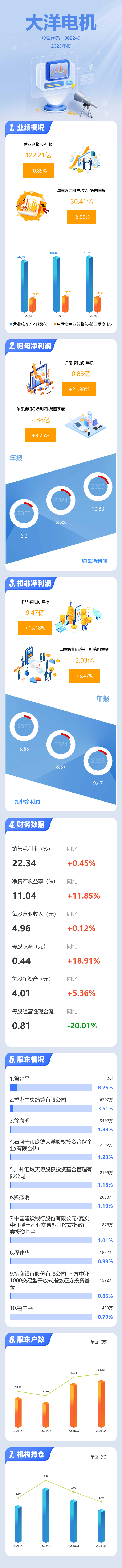 证券之星消息,大洋电机2025年年报显示,当年度公司主营收入122.21亿元,同比上升0.89%;归母净利润10.83亿元,同比上升21.99%;扣非净利润9.47亿元,同比上升13.19%;其中2025年第四季度,公司单季度主营收入30.41亿元,同比下降6.99%;单季度归母净利润2.38亿元,同比上升9.76%;单季度扣非净利润2.03亿元,同比上升5.47%;负债率46.18%,投资收益1.54亿元,财务费用-9209.16万元,毛利率22.34%。