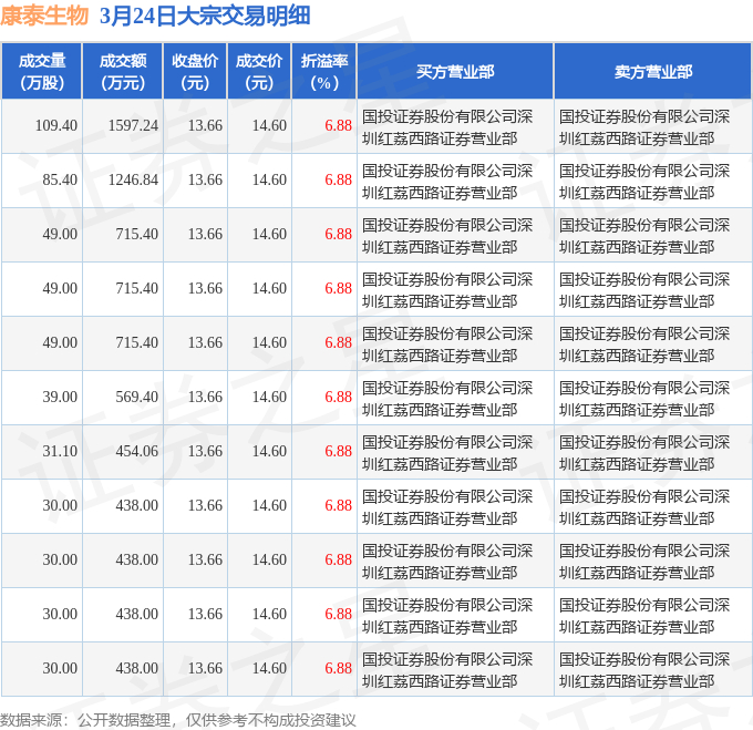 证券之星消息,3月24日康泰生物发生大宗交易,交易数据如下: