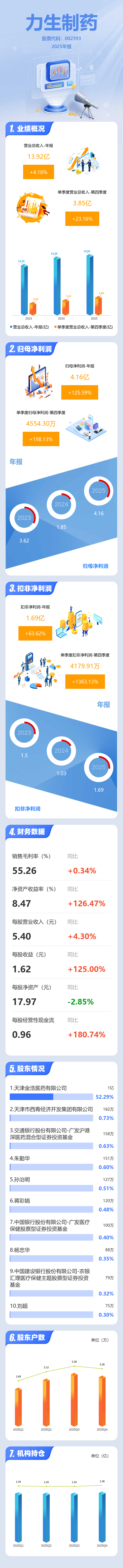 证券之星消息,力生制药2025年年报显示,当年度公司主营收入13.92亿元,同比上升4.18%;归母净利润4.16亿元,同比上升125.59%;扣非净利润1.69亿元,同比上升63.62%;其中2025年第四季度,公司单季度主营收入3.85亿元,同比上升23.16%;单季度归母净利润4554.3万元,同比上升198.13%;单季度扣非净利润4179.91万元,同比上升1363.13%;负债率16.54%,投资收益3.25亿元,财务费用-4863.99万元,毛利率55.26%。