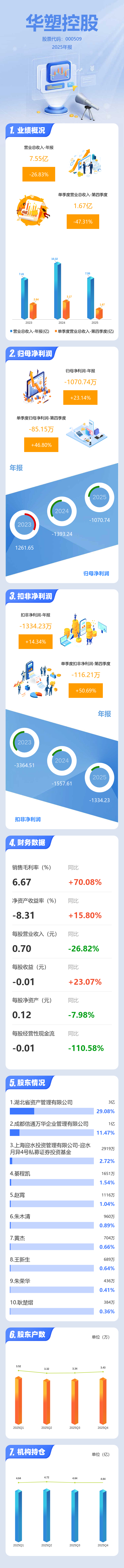 证券之星消息,华塑控股2025年年报显示,当年度公司主营收入7.55亿元,同比下降26.83%;归母净利润-1070.74万元,同比上升23.15%;扣非净利润-1334.23万元,同比上升14.34%;其中2025年第四季度,公司单季度主营收入1.67亿元,同比下降47.32%;单季度归母净利润-85.15万元,同比上升46.8%;单季度扣非净利润-116.21万元,同比上升50.7%;负债率78.06%,财务费用1496.43万元,毛利率6.67%。