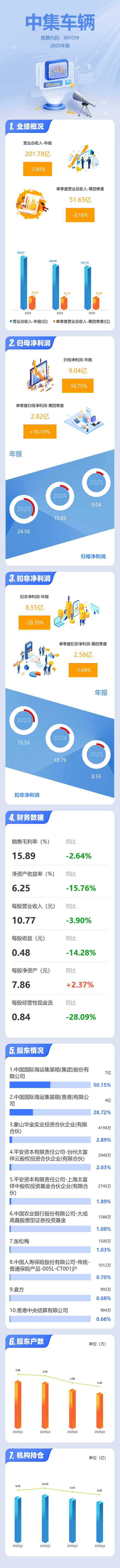 证券之星消息,中集车辆2025年年报显示,当年度公司主营收入201.78亿元,同比下降3.91%;归母净利润9.04亿元,同比下降16.75%;扣非净利润8.55亿元,同比下降20.71%;其中2025年第四季度,公司单季度主营收入51.65亿元,同比下降0.19%;单季度归母净利润2.82亿元,同比上升16.14%;单季度扣非净利润2.58亿元,同比下降1.04%;负债率33.32%,投资收益-1238.21万元,财务费用-1.25亿元,毛利率15.89%。
