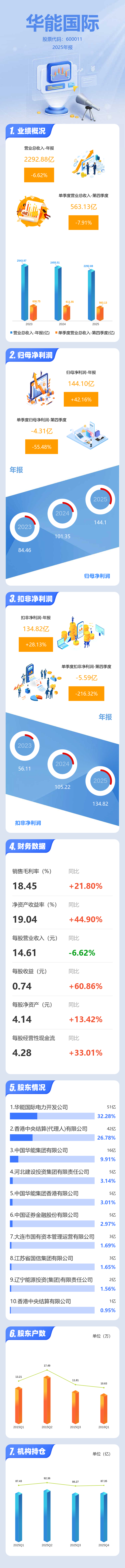 证券之星消息,华能国际2025年年报显示,当年度公司主营收入2292.88亿元,同比下降6.62%;归母净利润144.1亿元,同比上升42.17%;扣非净利润134.82亿元,同比上升28.13%;其中2025年第四季度,公司单季度主营收入563.13亿元,同比下降7.92%;单季度归母净利润-4.31亿元,同比下降55.49%;单季度扣非净利润-5.59亿元,同比下降216.32%;负债率65.26%,投资收益11.41亿元,财务费用67.54亿元,毛利率18.45%。