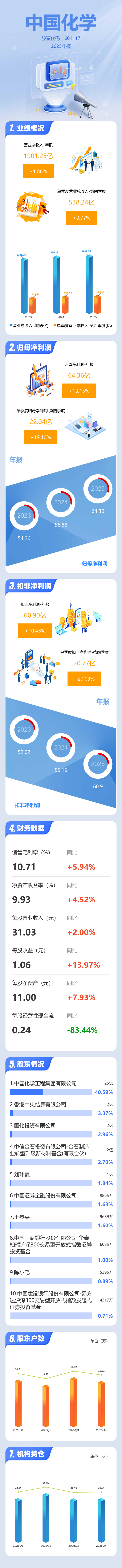 证券之星消息,中国化学2025年年报显示,当年度公司主营收入1901.25亿元,同比上升1.88%;归母净利润64.36亿元,同比上升13.15%;扣非净利润60.9亿元,同比上升10.44%;其中2025年第四季度,公司单季度主营收入538.24亿元,同比上升3.77%;单季度归母净利润22.04亿元,同比上升19.11%;单季度扣非净利润20.77亿元,同比上升27.1%;负债率69.86%,投资收益-1568.51万元,财务费用2.29亿元,毛利率10.71%。