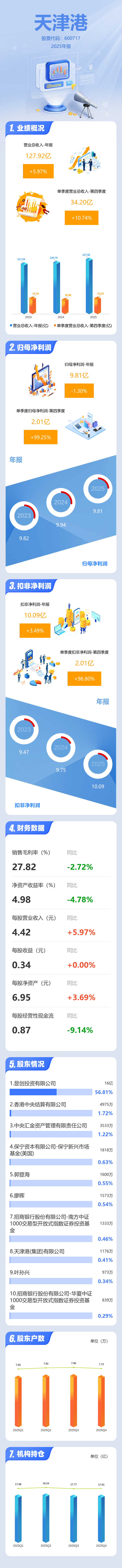 证券之星消息,天津港2025年年报显示,当年度公司主营收入127.92亿元,同比上升5.98%;归母净利润9.81亿元,同比下降1.3%;扣非净利润10.09亿元,同比上升3.49%;其中2025年第四季度,公司单季度主营收入34.2亿元,同比上升10.74%;单季度归母净利润2.01亿元,同比上升99.25%;单季度扣非净利润2.01亿元,同比上升96.8%;负债率25.22%,投资收益3.6亿元,财务费用7405.21万元,毛利率27.82%。