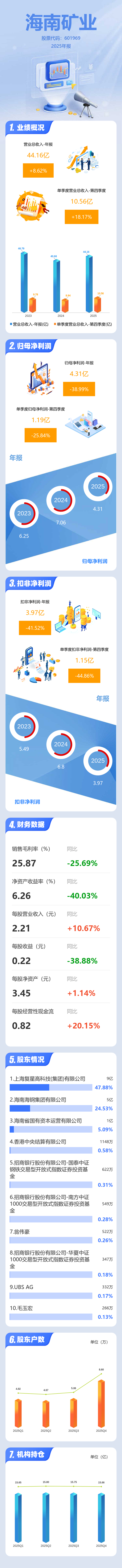 证券之星消息,海南矿业2025年年报显示,当年度公司主营收入44.16亿元,同比上升8.62%;归母净利润4.31亿元,同比下降38.99%;扣非净利润3.97亿元,同比下降41.52%;其中2025年第四季度,公司单季度主营收入10.56亿元,同比上升18.18%;单季度归母净利润1.19亿元,同比下降25.84%;单季度扣非净利润1.15亿元,同比下降44.86%;负债率46.9%,投资收益2557.45万元,财务费用8697.57万元,毛利率25.87%。