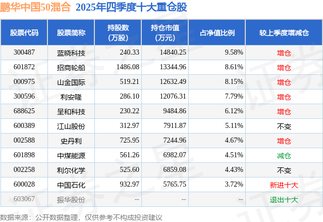 根据2025基金年报公募基金重仓股数据,重仓该股的公募基金共3家,其中持有数量最多的公募基金为鹏华基金的鹏华中国50混合。鹏华中国50混合目前规模为15.5亿元,最新净值2.861(3月24日),较上一交易日上涨1.78%,近一年上涨62.65%。该公募基金现任基金经理为王云鹏。王云鹏在任的基金产品包括:鹏华新材料混合发起式A,管理时间为2023年3月28日至今,期间收益率为28.36%;鹏华信用增利债券A,管理时间为2026年2月11日至今,期间收益率为-0.4%。