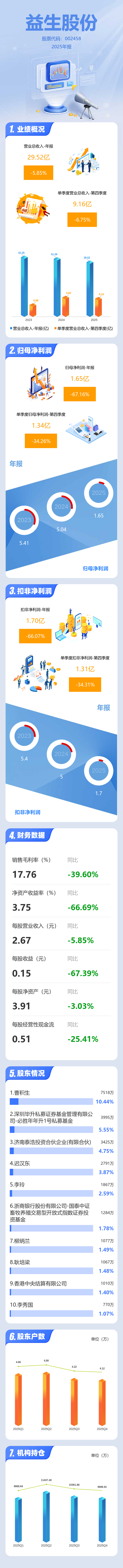 证券之星消息,益生股份2025年年报显示,当年度公司主营收入29.52亿元,同比下降5.85%;归母净利润1.65亿元,同比下降67.17%;扣非净利润1.7亿元,同比下降66.08%;其中2025年第四季度,公司单季度主营收入9.16亿元,同比下降6.75%;单季度归母净利润1.34亿元,同比下降34.26%;单季度扣非净利润1.31亿元,同比下降34.31%;负债率35.68%,投资收益-2399.75万元,财务费用1327.04万元,毛利率17.76%。