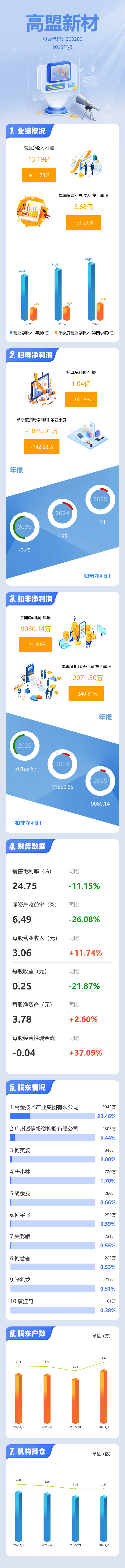 证券之星消息,高盟新材2025年年报显示,当年度公司主营收入13.19亿元,同比上升11.74%;归母净利润1.04亿元,同比下降23.18%;扣非净利润9080.14万元,同比下降21.39%;其中2025年第四季度,公司单季度主营收入3.68亿元,同比上升30.2%;单季度归母净利润-1049.01万元,同比下降142.23%;单季度扣非净利润-2071.3万元,同比下降240.32%;负债率35.16%,投资收益126.06万元,财务费用-600.2万元,毛利率24.75%。