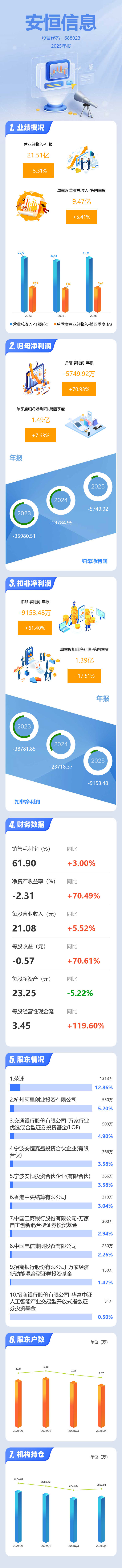 证券之星消息,安恒信息2025年年报显示,当年度公司主营收入21.51亿元,同比上升5.32%;归母净利润-5749.92万元,同比上升70.94%;扣非净利润-9153.48万元,同比上升61.41%;其中2025年第四季度,公司单季度主营收入9.47亿元,同比上升5.42%;单季度归母净利润1.49亿元,同比上升7.63%;单季度扣非净利润1.39亿元,同比上升17.52%;负债率46.51%,投资收益1388.17万元,财务费用3189.48万元,毛利率61.9%。