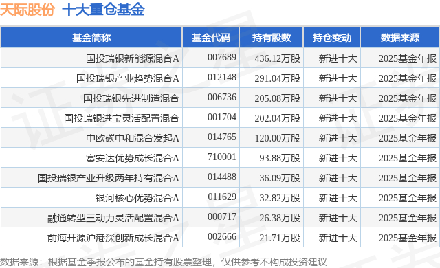 根据2025基金年报公募基金重仓股数据,重仓该股的公募基金共19家,其中持有数量最多的公募基金为国投瑞银基金的国投瑞银新能源混合A。国投瑞银新能源混合A目前规模为20.36亿元,最新净值2.2762(3月25日),较上一交易日上涨1.59%,近一年上涨64.52%。该公募基金现任基金经理为施成。施成在任的基金产品包括:国投瑞银先进制造混合,管理时间为2019年3月29日至今,期间收益率为185.76%;国投瑞银进宝灵活配置混合,管理时间为2020年1月23日至今,期间收益率为94.23%;国投瑞银产业趋势混合A,管理时间为2021年6月9日至今,期间收益率为-3.79%。