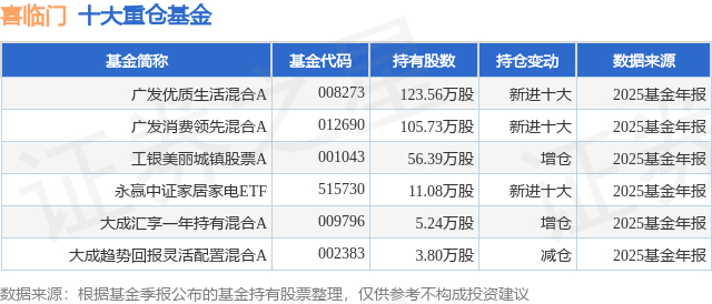 根据2025基金年报公募基金重仓股数据,重仓该股的公募基金共6家,其中持有数量最多的公募基金为广发基金的广发优质生活混合A。广发优质生活混合A目前规模为5.51亿元,最新净值1.3213(3月25日),较上一交易日上涨1.33%,近一年下跌1.29%。该公募基金现任基金经理为王鹏。王鹏在任的基金产品包括:广发消费领先混合A,管理时间为2023年6月13日至今,期间收益率为-11.23%;广发趋势动力混合A,管理时间为2025年12月10日至今,期间收益率为-7.33%。