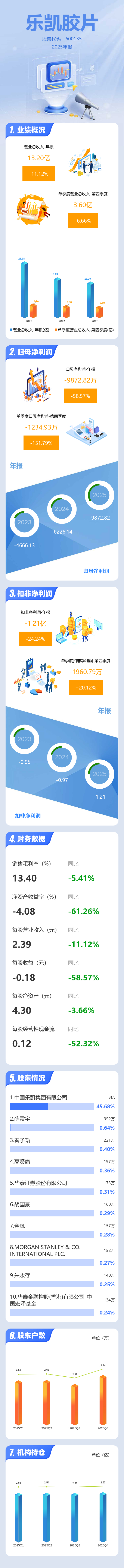 证券之星消息,乐凯胶片2025年年报显示,当年度公司主营收入13.2亿元,同比下降11.13%;归母净利润-9872.82万元,同比下降58.57%;扣非净利润-1.21亿元,同比下降24.24%;其中2025年第四季度,公司单季度主营收入3.6亿元,同比下降6.67%;单季度归母净利润-1234.93万元,同比下降151.79%;单季度扣非净利润-1960.79万元,同比上升20.12%;负债率13.76%,投资收益265.39万元,财务费用-820.8万元,毛利率13.4%。