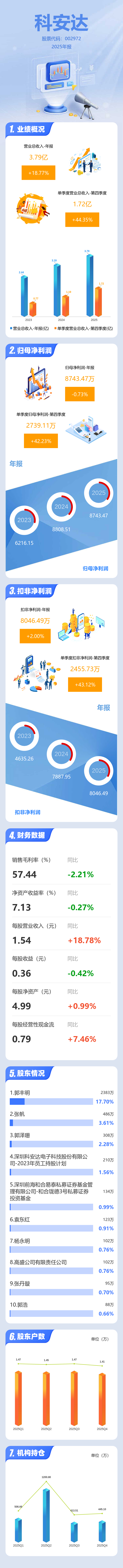 证券之星消息,科安达2025年年报显示,当年度公司主营收入3.79亿元,同比上升18.78%;归母净利润8743.47万元,同比下降0.74%;扣非净利润8046.49万元,同比上升2.01%;其中2025年第四季度,公司单季度主营收入1.72亿元,同比上升44.36%;单季度归母净利润2739.11万元,同比上升42.23%;单季度扣非净利润2455.73万元,同比上升43.13%;负债率13.6%,投资收益635.06万元,财务费用-828.53万元,毛利率57.44%。