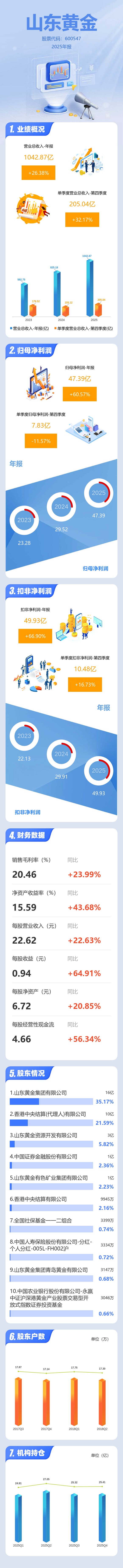 证券之星消息,山东黄金2025年年报显示,当年度公司主营收入1042.87亿元,同比上升26.38%;归母净利润47.39亿元,同比上升60.57%;扣非净利润49.93亿元,同比上升66.91%;其中2025年第四季度,公司单季度主营收入205.04亿元,同比上升32.18%;单季度归母净利润7.83亿元,同比下降11.57%;单季度扣非净利润10.48亿元,同比上升16.73%;负债率62.21%,投资收益-5.7亿元,财务费用19.1亿元,毛利率20.46%。