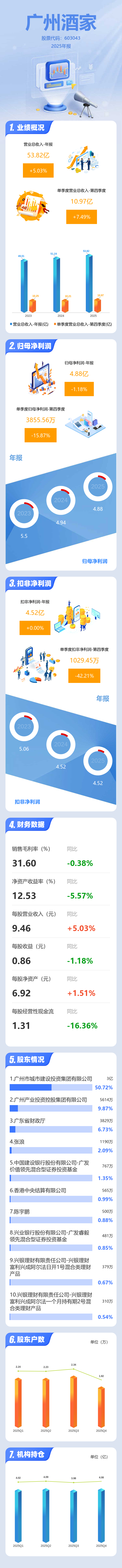 证券之星消息,广州酒家2025年年报显示,当年度公司主营收入53.82亿元,同比上升5.04%;归母净利润4.88亿元,同比下降1.19%;扣非净利润4.52亿元,同比上升0.0%;其中2025年第四季度,公司单季度主营收入10.97亿元,同比上升7.49%;单季度归母净利润3855.56万元,同比下降15.88%;单季度扣非净利润1029.45万元,同比下降42.22%;负债率39.75%,投资收益1666.27万元,财务费用-2791.66万元,毛利率31.6%。