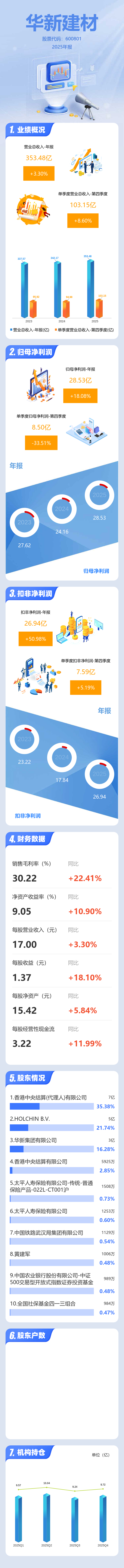 证券之星消息,华新建材2025年年报显示,当年度公司主营收入353.48亿元,同比上升3.31%;归母净利润28.53亿元,同比上升18.09%;扣非净利润26.94亿元,同比上升50.98%;其中2025年第四季度,公司单季度主营收入103.15亿元,同比上升8.6%;单季度归母净利润8.5亿元,同比下降33.52%;单季度扣非净利润7.59亿元,同比上升5.2%;负债率53.87%,投资收益3210.41万元,财务费用8.34亿元,毛利率30.22%。