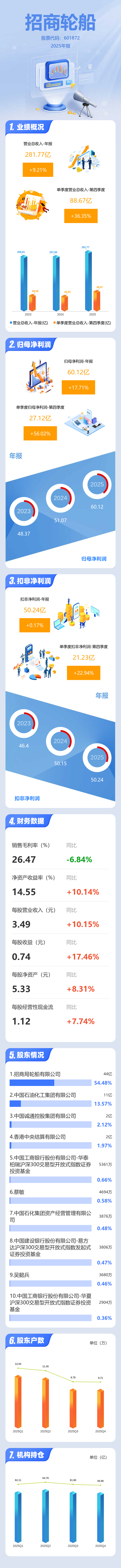 证券之星消息,招商轮船2025年年报显示,当年度公司主营收入281.77亿元,同比上升9.22%;归母净利润60.12亿元,同比上升17.71%;扣非净利润50.24亿元,同比上升0.18%;其中2025年第四季度,公司单季度主营收入88.67亿元,同比上升36.36%;单季度归母净利润27.12亿元,同比上升56.03%;单季度扣非净利润21.23亿元,同比上升22.95%;负债率46.68%,投资收益7.89亿元,财务费用11.6亿元,毛利率26.47%。