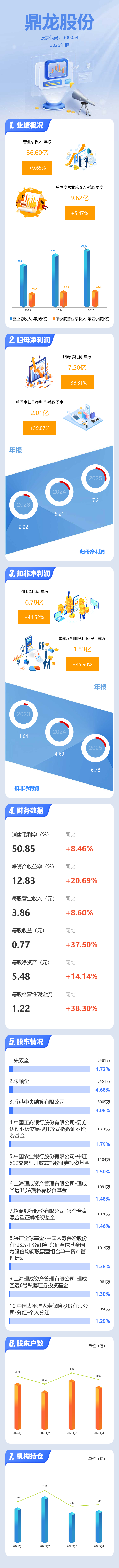 证券之星消息,鼎龙股份2025年年报显示,当年度公司主营收入36.6亿元,同比上升9.66%;归母净利润7.2亿元,同比上升38.32%;扣非净利润6.78亿元,同比上升44.53%;其中2025年第四季度,公司单季度主营收入9.62亿元,同比上升5.48%;单季度归母净利润2.01亿元,同比上升39.07%;单季度扣非净利润1.83亿元,同比上升45.9%;负债率39.17%,投资收益2630.22万元,财务费用4967.78万元,毛利率50.85%。