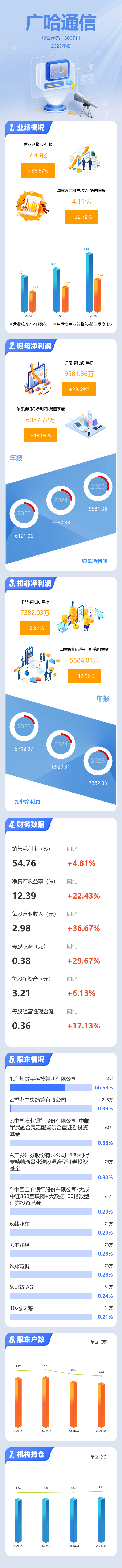 证券之星消息,广哈通信2025年年报显示,当年度公司主营收入7.43亿元,同比上升36.68%;归母净利润9581.36万元,同比上升29.7%;扣非净利润7382.03万元,同比上升6.67%;其中2025年第四季度,公司单季度主营收入4.11亿元,同比上升32.73%;单季度归母净利润6037.72万元,同比上升14.1%;单季度扣非净利润5884.01万元,同比上升13.06%;负债率38.64%,投资收益263.95万元,财务费用-406.74万元,毛利率54.76%。