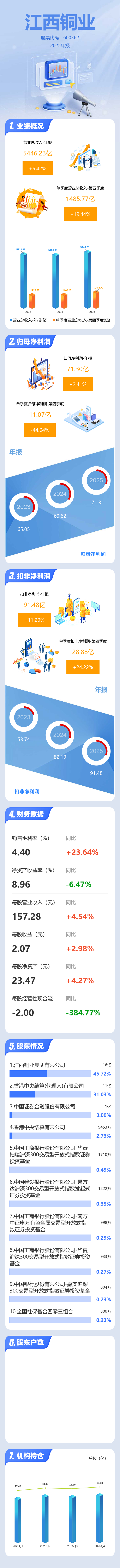 证券之星消息,江西铜业2025年年报显示,当年度公司主营收入5446.23亿元,同比上升5.42%;归母净利润71.3亿元,同比上升2.41%;扣非净利润91.48亿元,同比上升11.3%;其中2025年第四季度,公司单季度主营收入1485.77亿元,同比上升19.45%;单季度归母净利润11.07亿元,同比下降44.04%;单季度扣非净利润28.88亿元,同比上升24.22%;负债率56.95%,投资收益-24.12亿元,财务费用9.09亿元,毛利率4.4%。