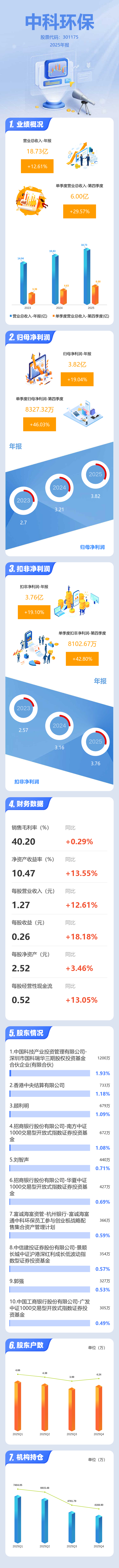 证券之星消息,中科环保2025年年报显示,当年度公司主营收入18.73亿元,同比上升12.62%;归母净利润3.82亿元,同比上升19.04%;扣非净利润3.76亿元,同比上升19.1%;其中2025年第四季度,公司单季度主营收入6.0亿元,同比上升29.58%;单季度归母净利润8327.32万元,同比上升46.04%;单季度扣非净利润8102.67万元,同比上升42.8%;负债率52.33%,投资收益62.28万元,财务费用7485.13万元,毛利率40.2%。