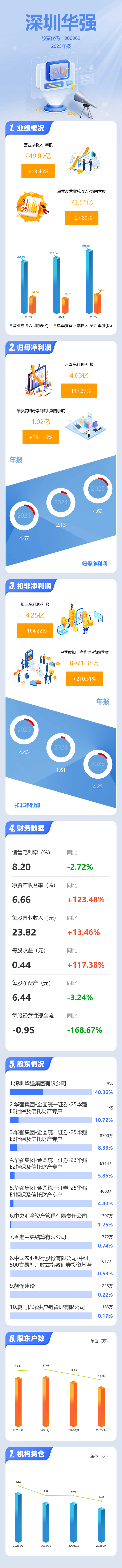 证券之星消息,深圳华强2025年年报显示,当年度公司主营收入249.09亿元,同比上升13.46%;归母净利润4.63亿元,同比上升117.38%;扣非净利润4.25亿元,同比上升164.22%;其中2025年第四季度,公司单季度主营收入72.51亿元,同比上升27.8%;单季度归母净利润1.02亿元,同比上升291.17%;单季度扣非净利润8971.35万元,同比上升210.31%;负债率58.36%,投资收益1706.07万元,财务费用2.24亿元,毛利率8.2%。