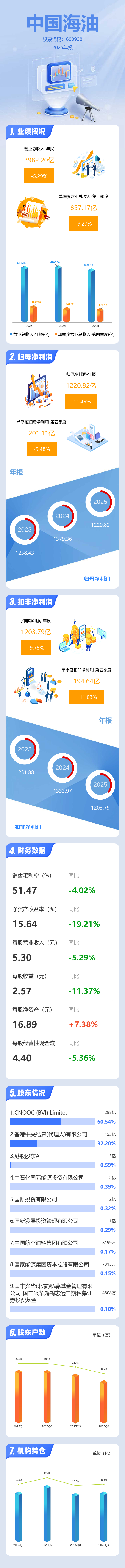 证券之星消息,中国海油2025年年报显示,当年度公司主营收入3982.2亿元,同比下降5.3%;归母净利润1220.82亿元,同比下降11.49%;扣非净利润1203.79亿元,同比下降9.76%;其中2025年第四季度,公司单季度主营收入857.17亿元,同比下降9.28%;单季度归母净利润201.11亿元,同比下降5.48%;单季度扣非净利润194.64亿元,同比上升11.04%;负债率26.71%,投资收益-9.43亿元,财务费用8.23亿元,毛利率51.47%。